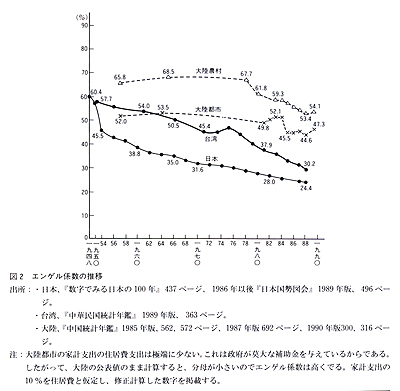 エンゲル係数は家計支出に占める食糧費支出の比率である。図2で示した。日本、台湾とも順調に低下していることがわかるが、大陸のほうは1978年頃から低下し始めている。しかし、都市はこの比率が一貫して下がらず、上下している。これは食料品の価格が政府統制下におかれており、政府が恣意的に決定しているためである。それでも全体として低下傾向になる。また、同係数が全体として高いのは、資本主義社会で家計支出に入る部分が都市では福祉として給与されているので、分母が小さい。家賃部分を調整したが、正確な分母がはじきだせないためであろう。