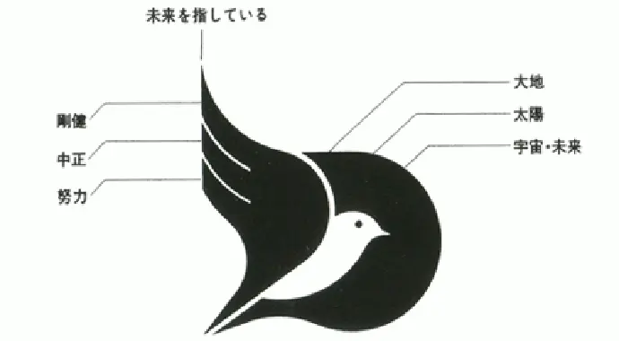 シンボルの羽の部分は三つに分け「剛健」「中正」「努力」を意味しています。その先端は未来を指し、今まさに大地から飛び立つ瞬間を表現しています。