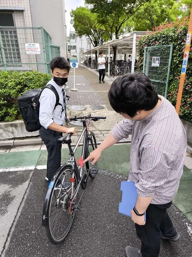 高校近辺の通学路にて、車道の逆走、並走等の危険運転、違反行為への指導。また登録シールの貼付確認をしています。