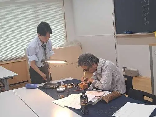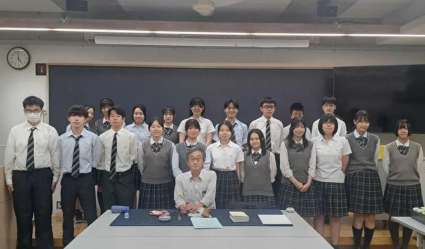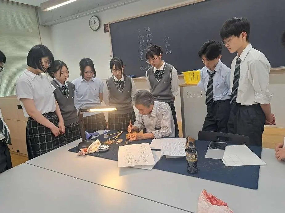 夏休み中の8月5日、書道部員は、大東文化大学文学部書道学科教授の綿引㴞天先生のご指導を受けました。綿引先生は、第一線でご活躍されている著名な篆刻家でいらっしゃいます。毎年夏、本校書道部のために篆刻講座を開いてくださっています。この日も、先生の素晴らしい技術を目の前で見せていただき、丁寧なご指導をいただいて、落款印を制作しました。