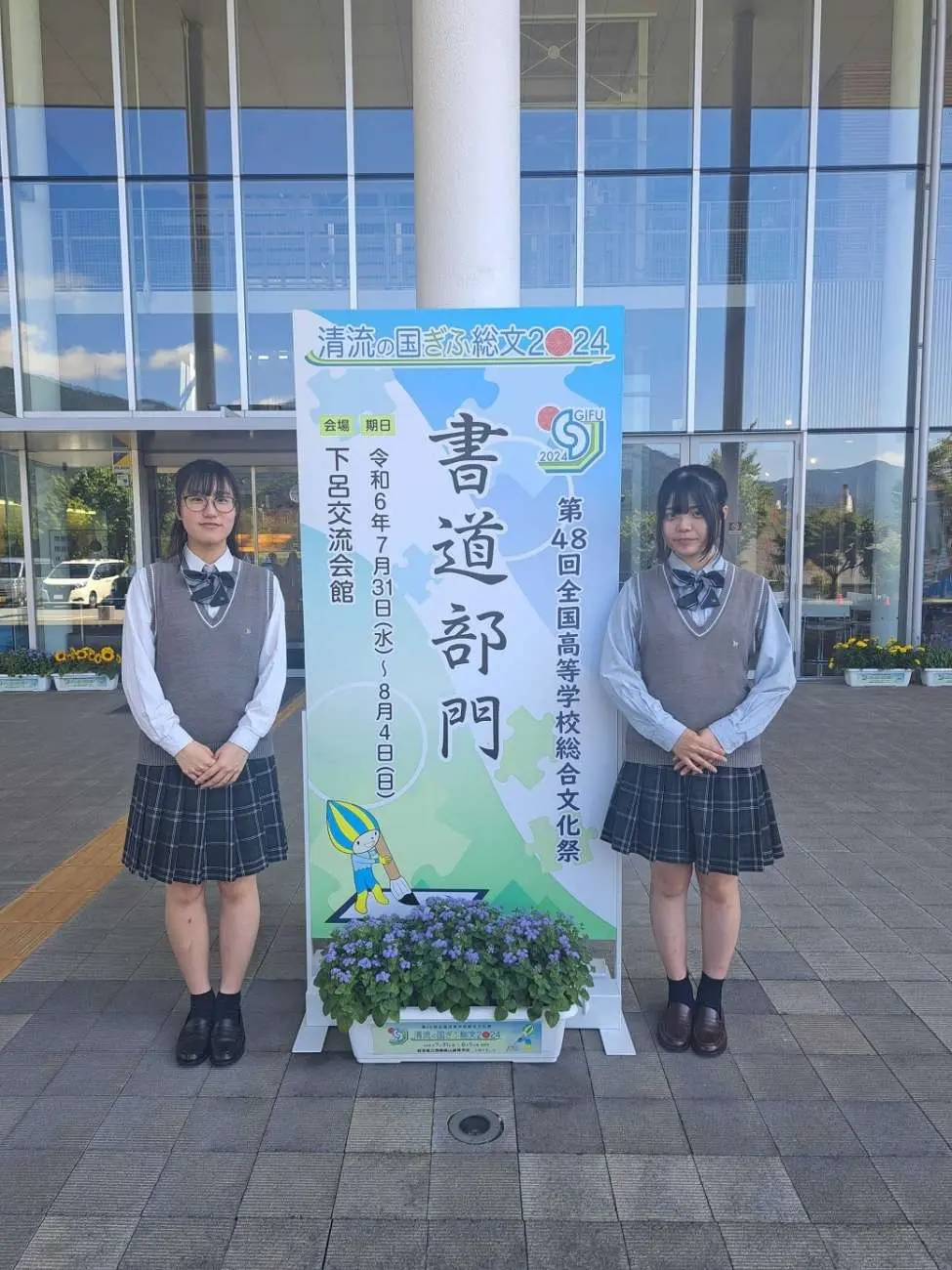 書道部門は岐阜県下呂市の下呂交流会館で開催されました。書道部3年の上野杏珠さんと中西美裕さんの2名が、東京都代表として出品しました。書道部の都代表は、20年連続を達成しています。全国展、企画展会場には全国からの代表作品が展示され、迫力ある大作群に圧倒されるほどでした。岐阜県内の高校ごとに工夫された地域にまつわる企画展も、大変興味深いものでした。