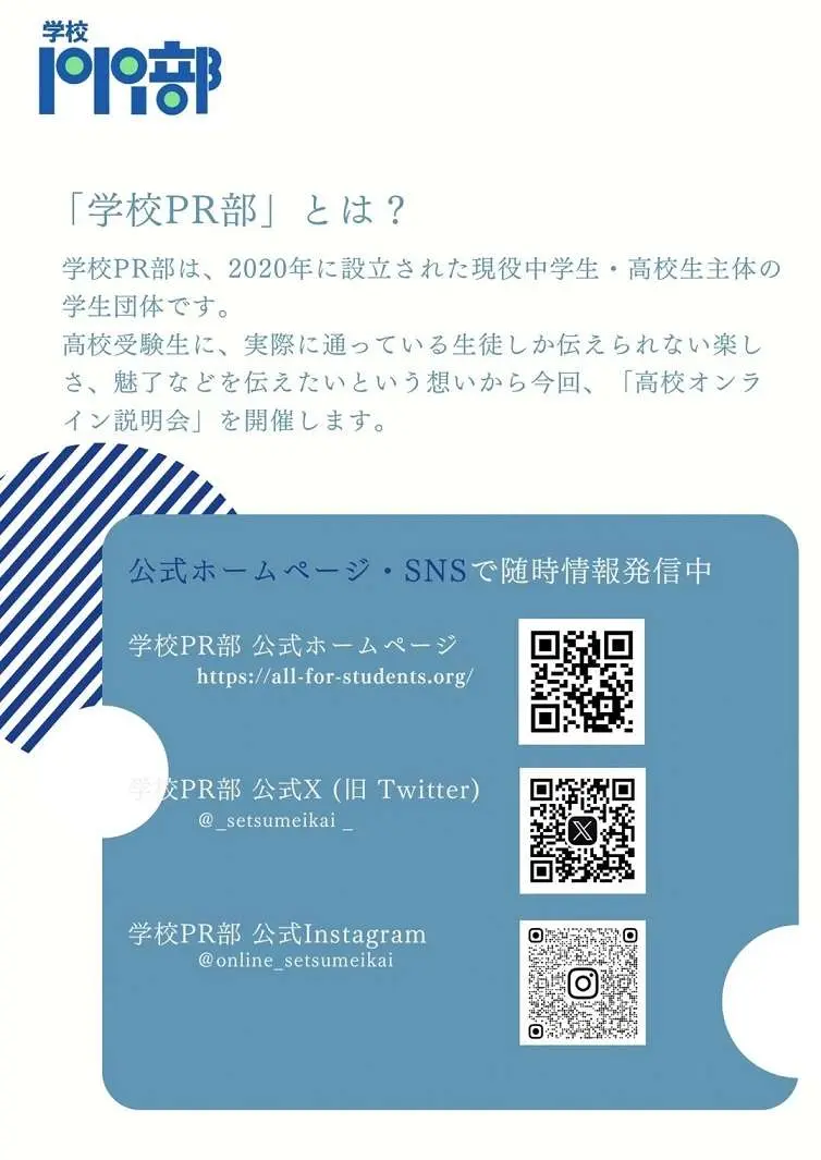 本校の入試補助生徒である「Admission Cast」が、2020年に設立された中学生・高校生主体の学生団体「PR部」主催による「高校オンライン説明会」に参加いたします。