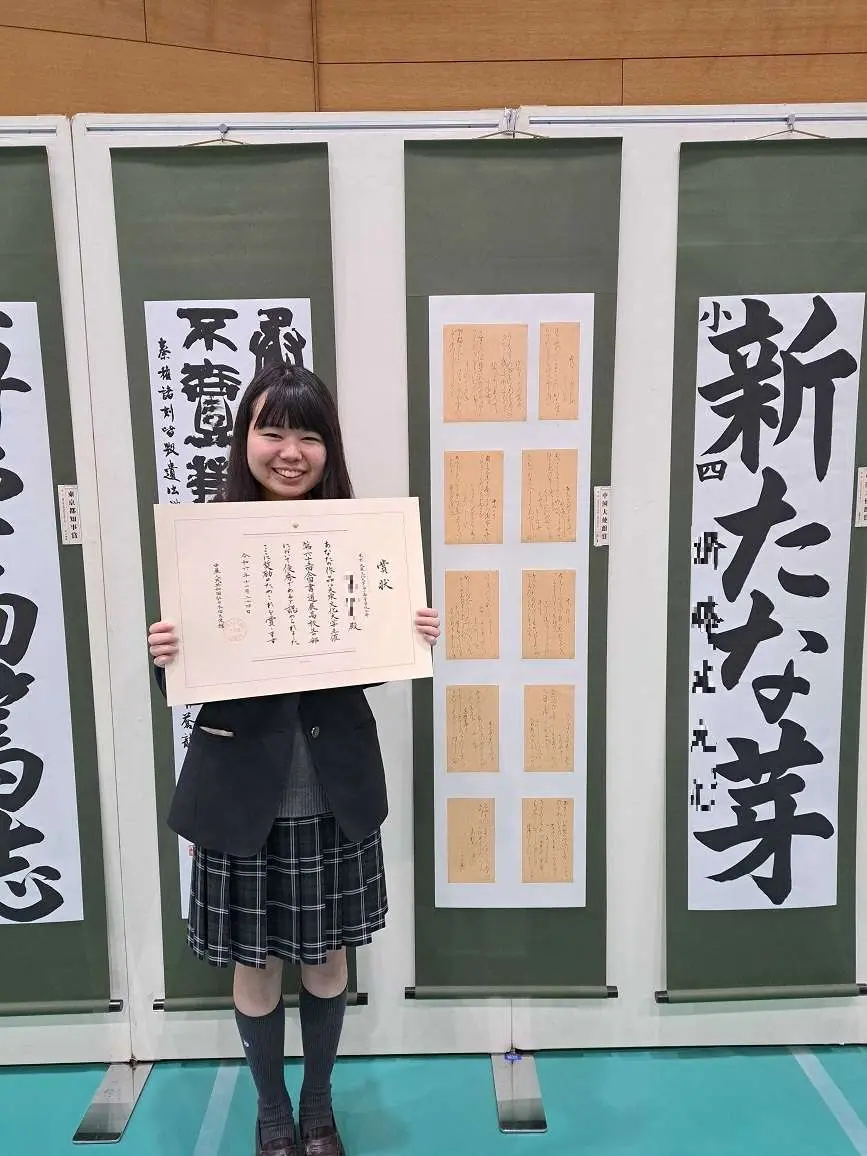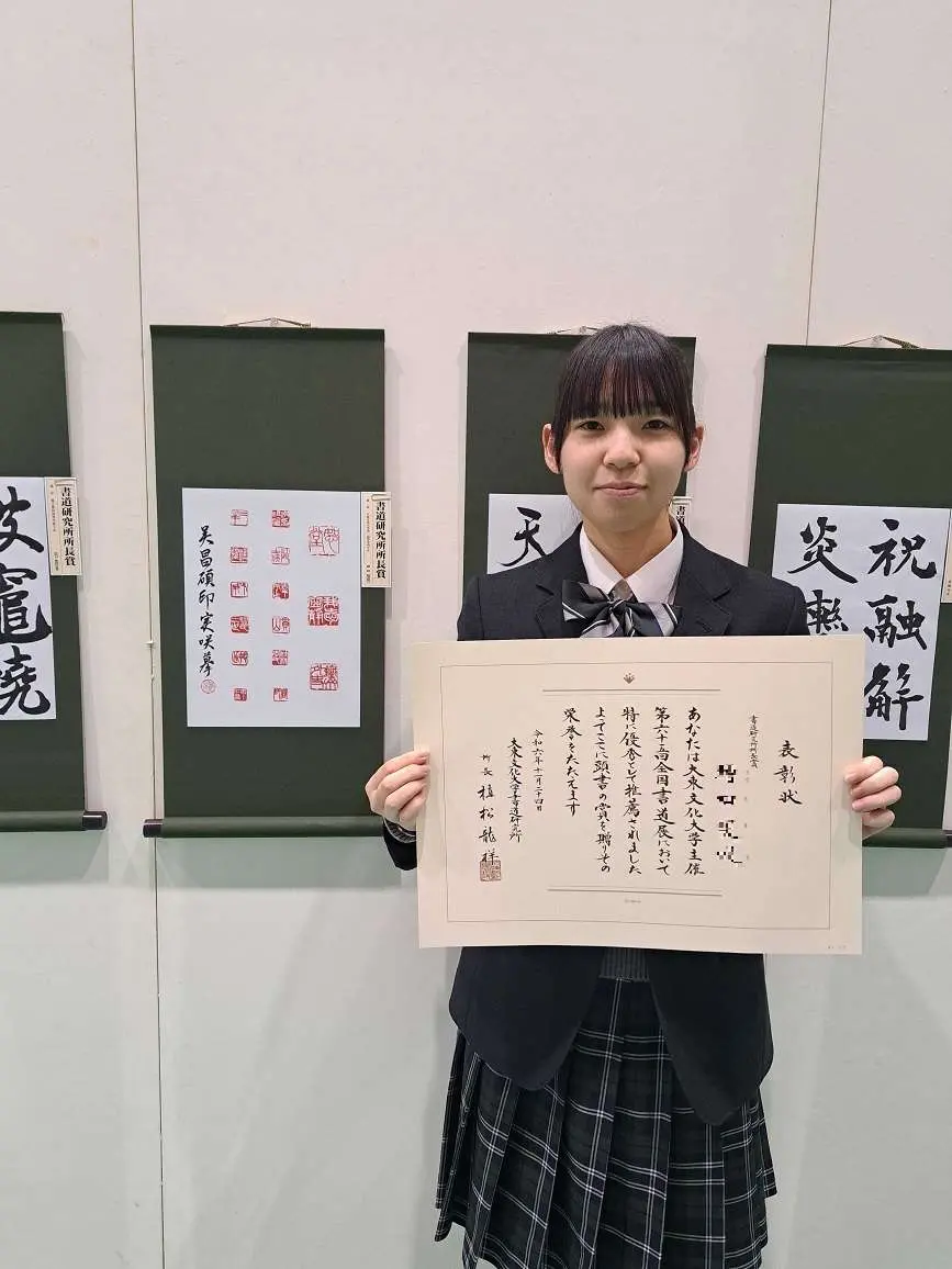 本校書道部生徒2名及び団体、優秀指導者賞の表彰を受けました。また、部員6名の作品が展示されました。