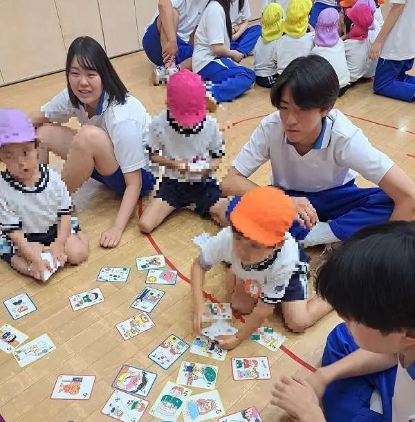 生徒たちは、自作の絵本や「食育かるた」を持参し、園児と楽しく交流。笑顔あふれるひとときとなりました。