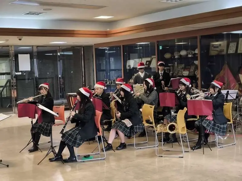 本日(12月24日)、ホームルーム終了後に吹奏楽部によるミニコンサートが校内で行われました。ホリデーシーズンに合わせた華やかな楽曲が次々と演奏され、温かい音色が廊下いっぱいに広がりました。