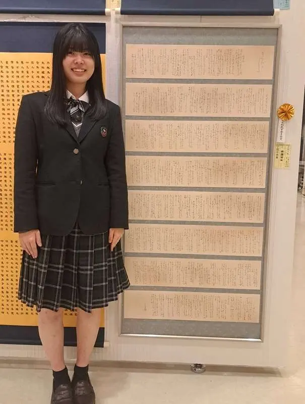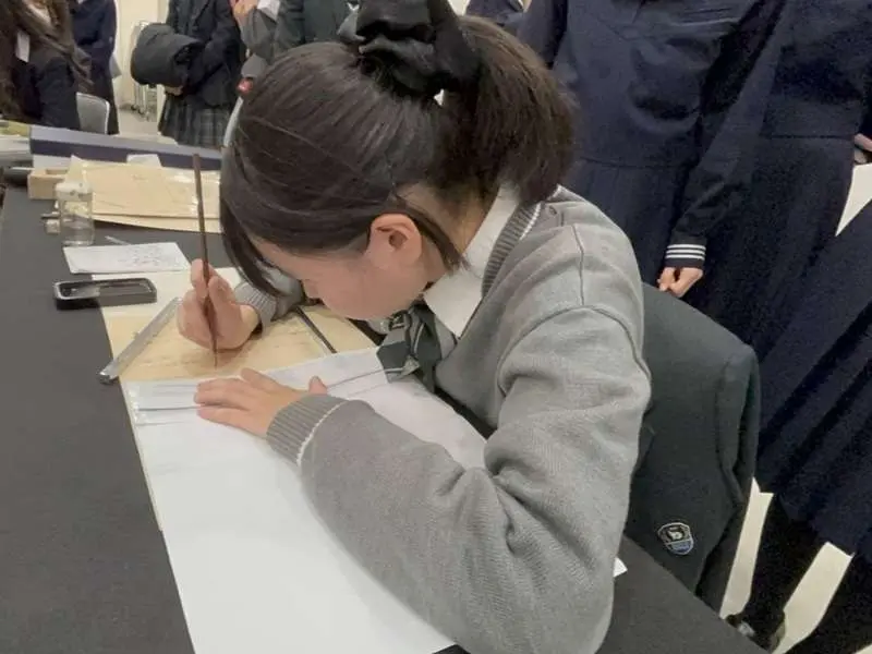 参加した本校3年生の生徒は、多くの来場者の前で緊張しながらも堂々と筆を執り、揮毫後のインタビューにも落ち着いて応えることができました。