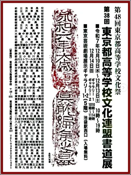 第38回東京都高等学校文化連盟書道展 日時:12/10(水)-13(土) 10:00-19:00 12/14(日) 10:00-14:00 場所:東京芸術劇場5階・ギャラリー1・2 |