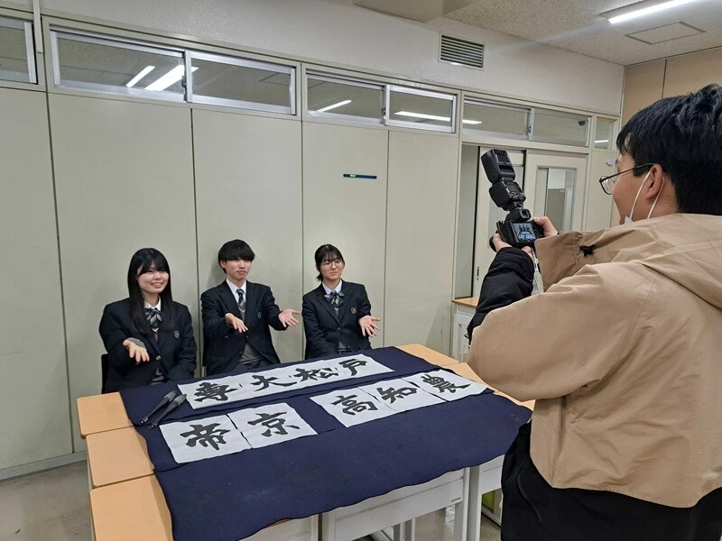 今大会では、「第34回国際高校生選抜書展(書の甲子園)」で地区優勝を果たした全国9校が揮毫を担当。本校は以下の3校のプラカードを心を込めて書き上げました。