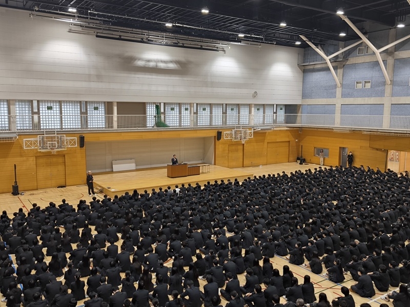 式では、まず校長先生より「2学期の振り返りと、冬休みの過ごし方」についてお話があり、生徒たちは静かに耳を傾けていました。