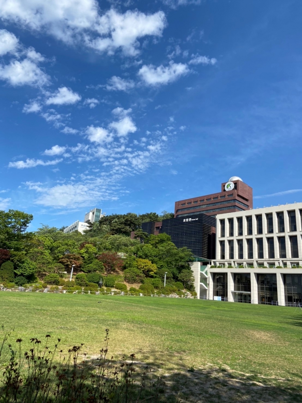 成均館大学のソウルキャンパスは、キャンパス内の高低差が大きいので対面授業の日は毎朝歩くのが大変です。スクールバスもありますが、寮の前からは乗れないので歩いて行っています。構内の高いところまで行くと南山ソウルタワーが見えたり遠くのアパートが見えたりと景色がとても良いです。