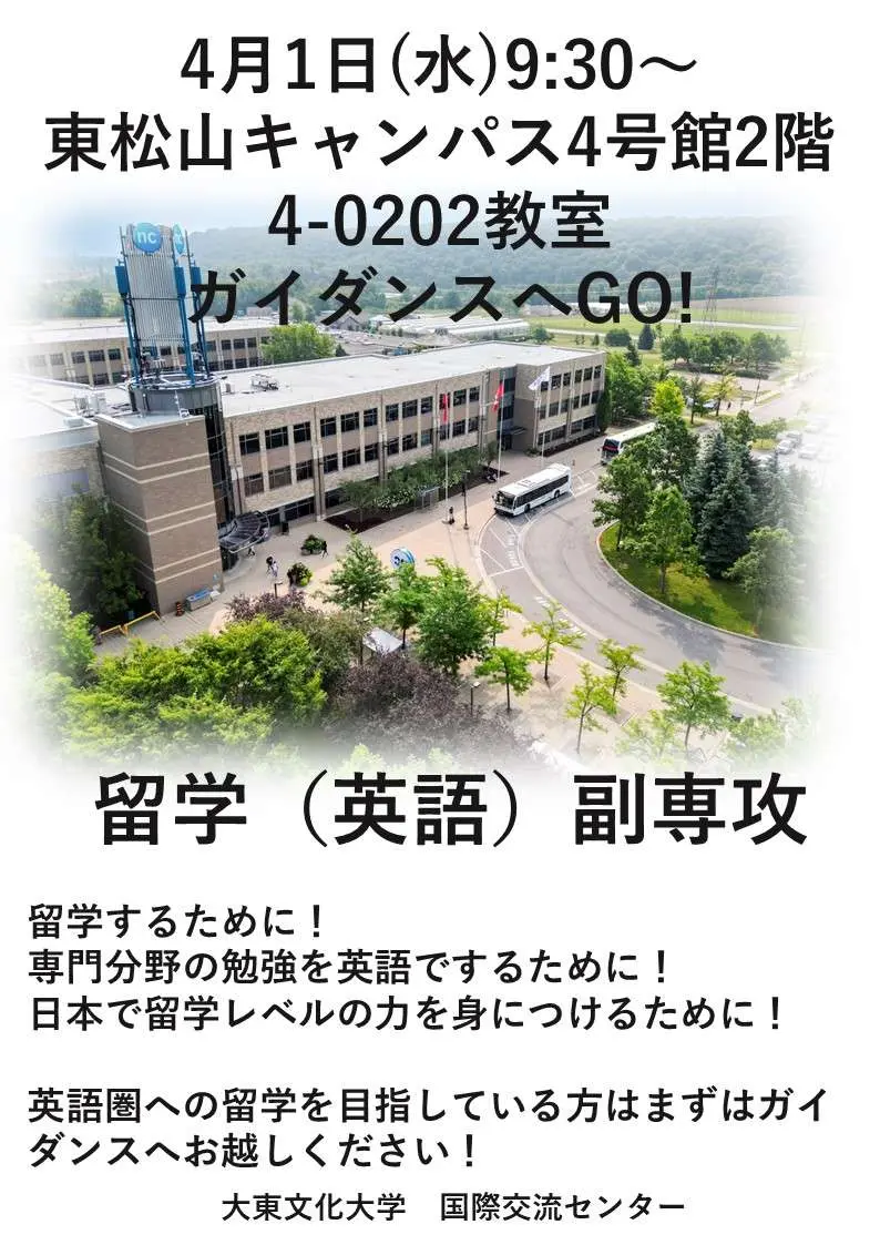 2026年4月1日(水)、東松山校舎4号館2階4-0202教室にて留学(英語)副専攻ガイダンスを実施します。