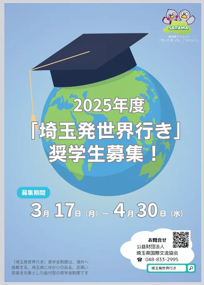 ◆「埼玉発世界行き」冠奨学金:日本人学生の留学を支援するため、企業や個人がスポンサーのオーダーメイド型の給付奨学金です。