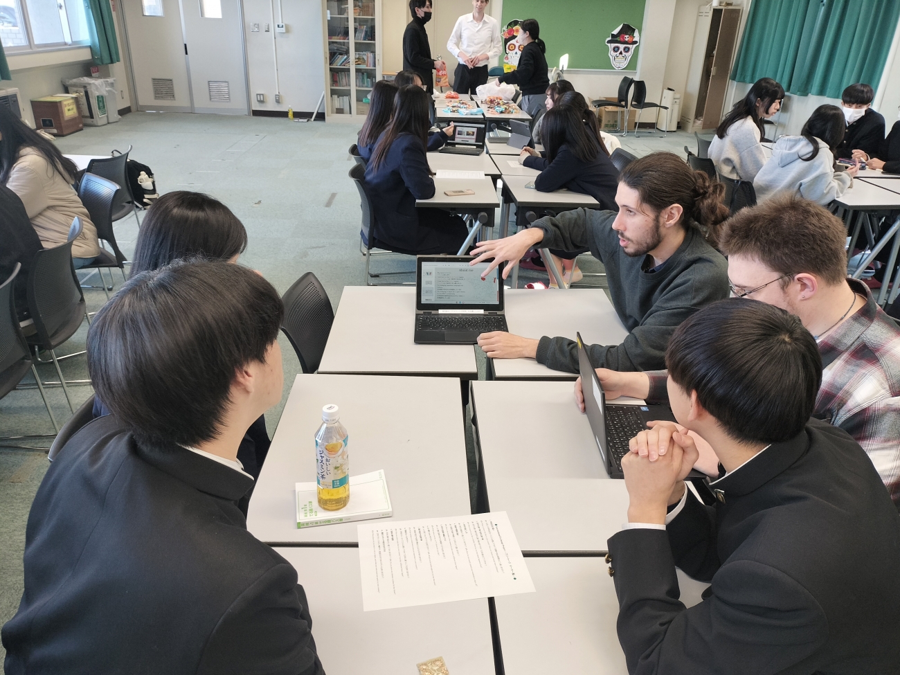まずは交流生による自己紹介のあと、高校生3、4名ずつのグループに、交流生が数名ずつ着席しました。そして交流生がスライドなどを使ってプレゼンテーションをしました。内容は、自己紹介や日本に留学した理由と自分の国の紹介についてです。プレゼンテーションの言語は、英語や日本語です。高校生は交流生に応じて英語や日本語で、交流生の国の言語や文化や歴史について、質問をしていました。