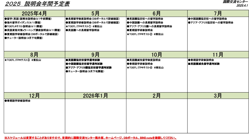 - 年間予定表以外にも多数説明会を実施していきますので、DBポータル、掲示版、国際交流ホームページを定期的に確認 してください。