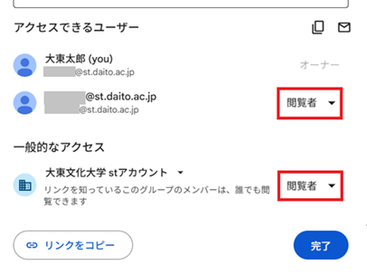 - 大東文化大学stアカウント:大東stGoogleアカウント(~@st.daito.ac.jp)を持つすべてのユーザーがファイルにアクセスできます。