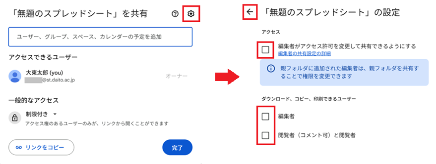 - 編集者がアクセス許可を変更して共有できるようにする:チェックすると「編集者」は他のユーザーのアクセス権を変更できるようになります。
