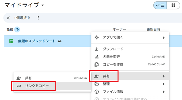 ⑥ 共有設定したファイルをもう1度右クリックし、「共有」>「リンクをコピー」をクリックします。共有リンクのURLがコピーされるので、共有相手に送ってください。