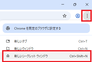 ① Google Chromeを開き、画面右上の「︙」をクリックし、展開されたメニューの中から「新しいシークレットウィンドウ」をクリックします。