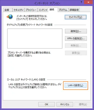 [接続]タブを選択して、ローカルエリアネットワーク(LAN)の設定より、[LANの設定]をクリックします。