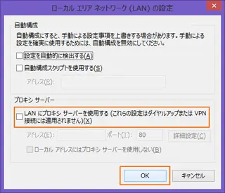 [プロキシサーバー]にチェックが入っていれば、[プロキシサーバー]のチェックを外して、[OK」をクリックします。