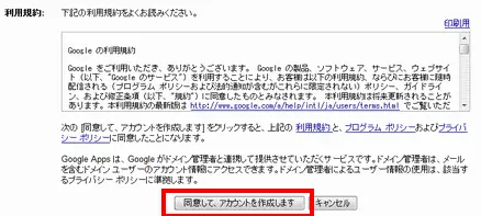 利用規約を読み、了承しましたら [同意して、アカウントを作成します] をクリックしてください。