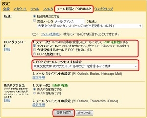 - ステータス:[すべてのメールでPOPを有効にする]を選択
