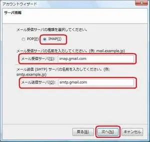メール受信サーバの種類は[IMAP]を選択してください。