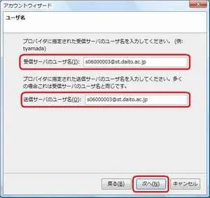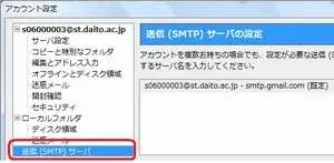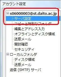 (例)s01012345@st.daito.ac.jp / t012345@st.daito.ac.jp送信サーバのユーザ名:各自のメールアドレス