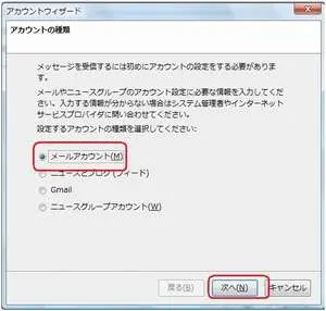 [メールアカウント]のチェックが入っているのを確認し、[次へ]をクリックします。
