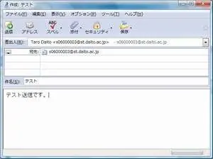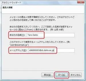 ここでは、仮のユーザ名[Taro Daito]とします。 漢字で入れる場合は、メールを受信する人が日本語を読めるかどうか考慮しましょう。[メールアドレス]の欄には、各自の大学専用のメールアドレスを入力します。メールアドレスは、半角英数字で次のように入力してください。