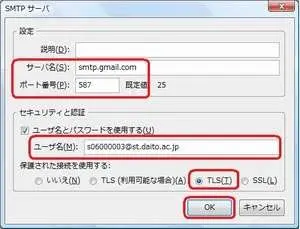 ※ユーザ名のみ入力されていた部分に「@st.daito.ac.jp」または「@ic.daito.ac.jp」と追記して完全なメールアドレスが入力されている状態にしてください。保護された接続を使用する:TLS