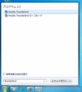 [スタート] → [プログラムとファイルの検索] 欄に thunderbird と入力すると、プログラムが表示されます。