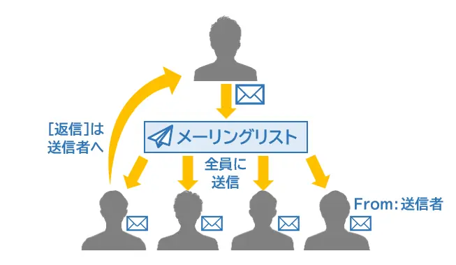 受信者が[返信]をクリックすると、送信者個人に返信されます。つまり[返信先]は送信者のアドレスになります。メーリングリスト全体には返信されません。