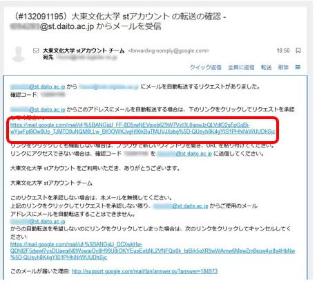 「●●●@st.daito.ac.jpのメールを▽▽▽@××××へ転送することを確認してください。」