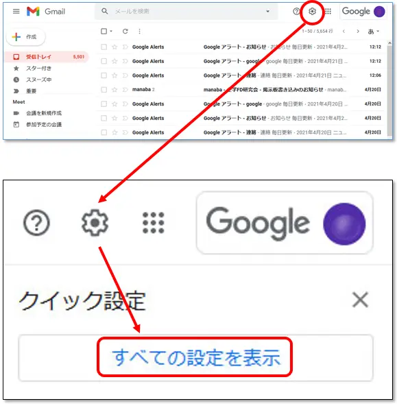 右上にある設定アイコン(歯車の形)をクリックし、[すべての設定を表示] をクリックします。