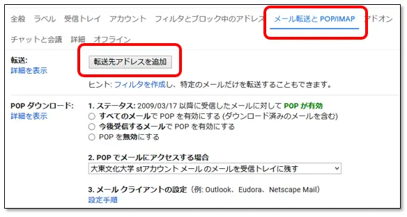 [メール転送と POP/IMAP] タブをクリックします。