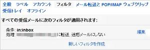 設定メニューから[フィルタとブロック中のアドレス]タブを選び、[新しいフィルタを作成]をクリック。