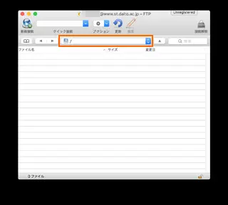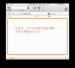 [Cyberduck]の、右図で示した橙色の枠内に、ファイルやフォルダをドラッグ&ドロップすると、アップロードできます。
