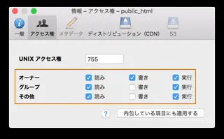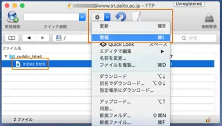 ファイルのアクセス権は、フォルダのアクセス権とは違った設定をします。こちらも、初期状態では適切に設定されているはずですが、公開がうまくいかないときには、以下の手順で確認して下さい。