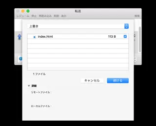 アップロード中に、右図のようなメッセージが出た場合、サーバ上にすでに同一ファイル名が存在します。更新したファイルを有効にしたい場合のみ、[続ける]ボタンをクリックしてください。上書きしたくない場合には、[キャンセル]ボタンをクリックしてください。