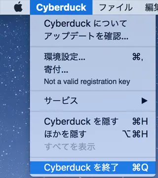 メニューバー[Cyberduck]から[Cyberduckを終了]を選択します。