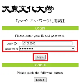 大東で設定している「ログイン認証画面」が表示されます。ユーザ名とパスワードを入力し「Login」ボタンを選択。[userID]欄入力例:・学生:s01012345・教職員:t012345[password]欄:情報実習教室・DBPortal等で利用しているものを入力。