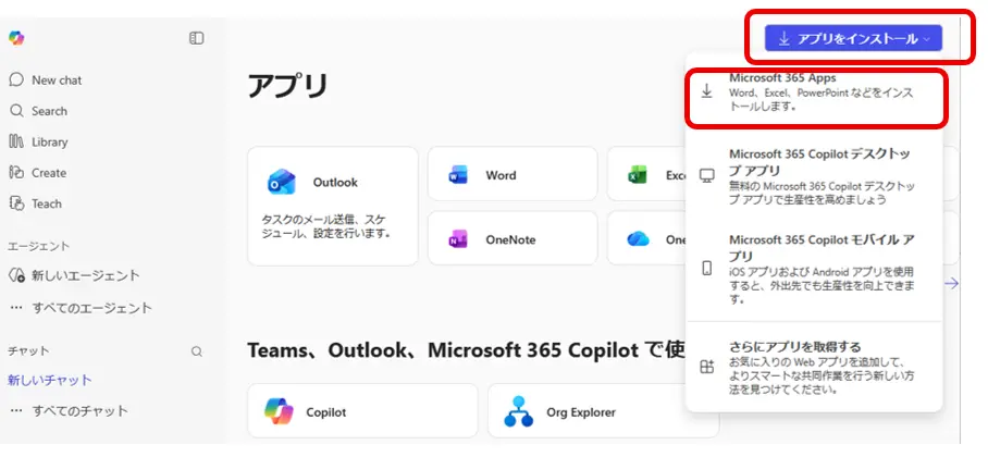 サインイン後、[アプリをインストール] から Microsoft365アプリのインストールを行ってください。