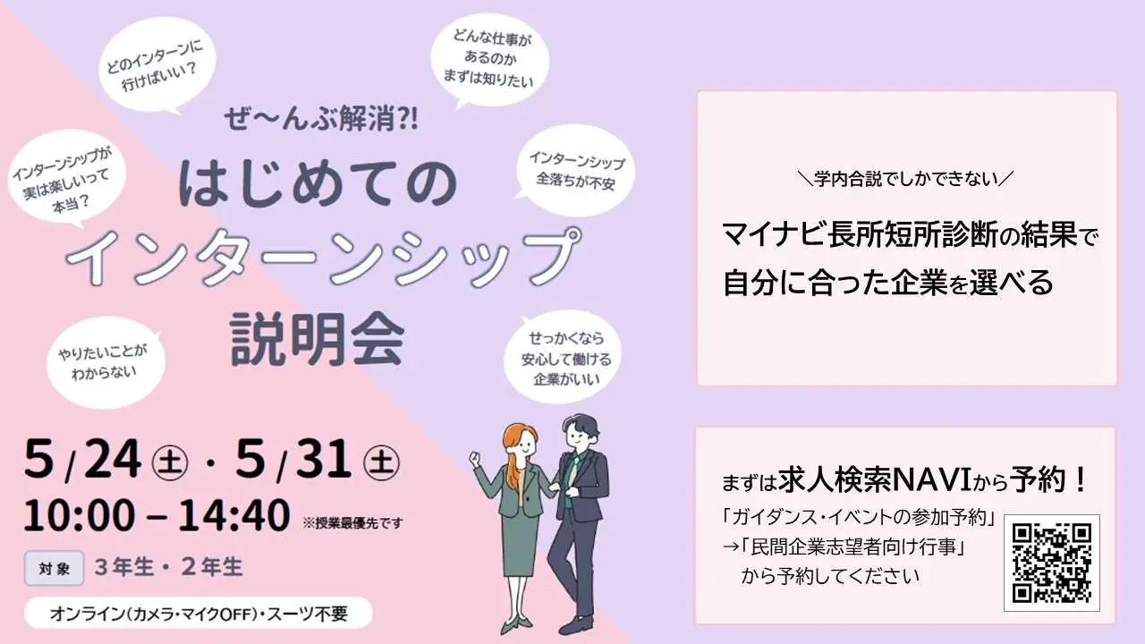 5月24日(土)・31(土)の2日間で、『はじめてのインターンシップ説明会(インターンシップ学内合同企業説明会)』を開催します。