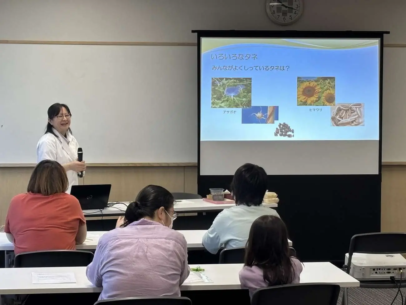 橋本みのり教授による「植物のタネを観察・実験してみよう!」では、身近な野菜の種を触りながら観察し、親子でつくった種の模型を飛ばして距離を競い合いました。普段の小学校とはひと味違った実験を通して親子で楽しみながら「理科」の分野を学びました。