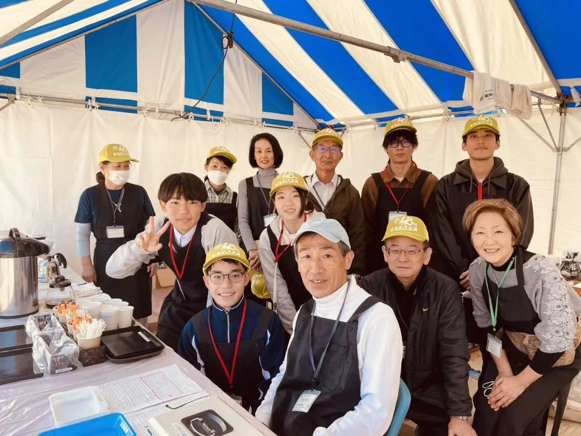 東松山市国際交流会のウェルカムブースでは、本学の留学生もボランティアとして参加してシフォンケーキやコーヒーなどの飲食物の販売や通訳を行い、来場者と交流しました。