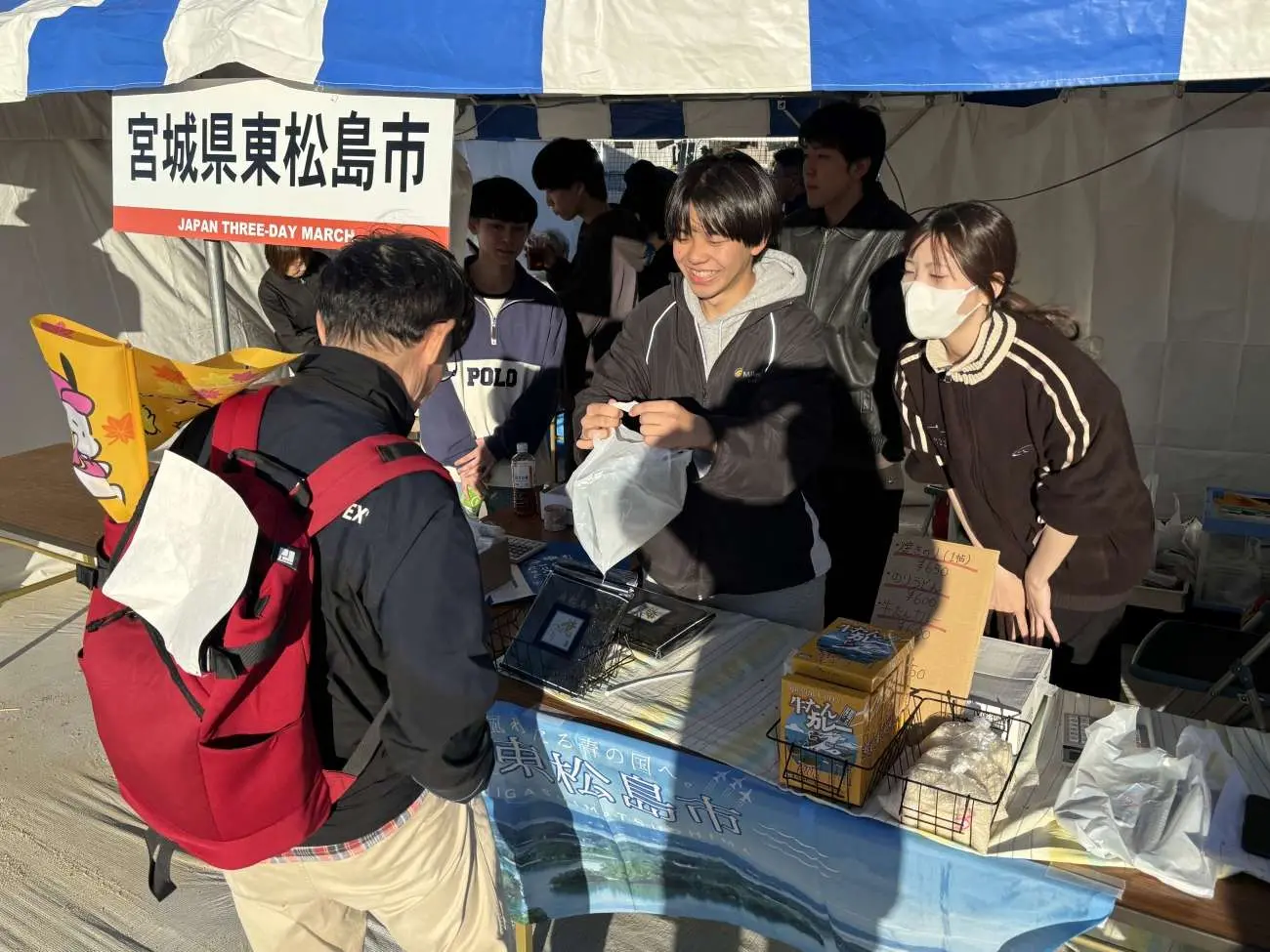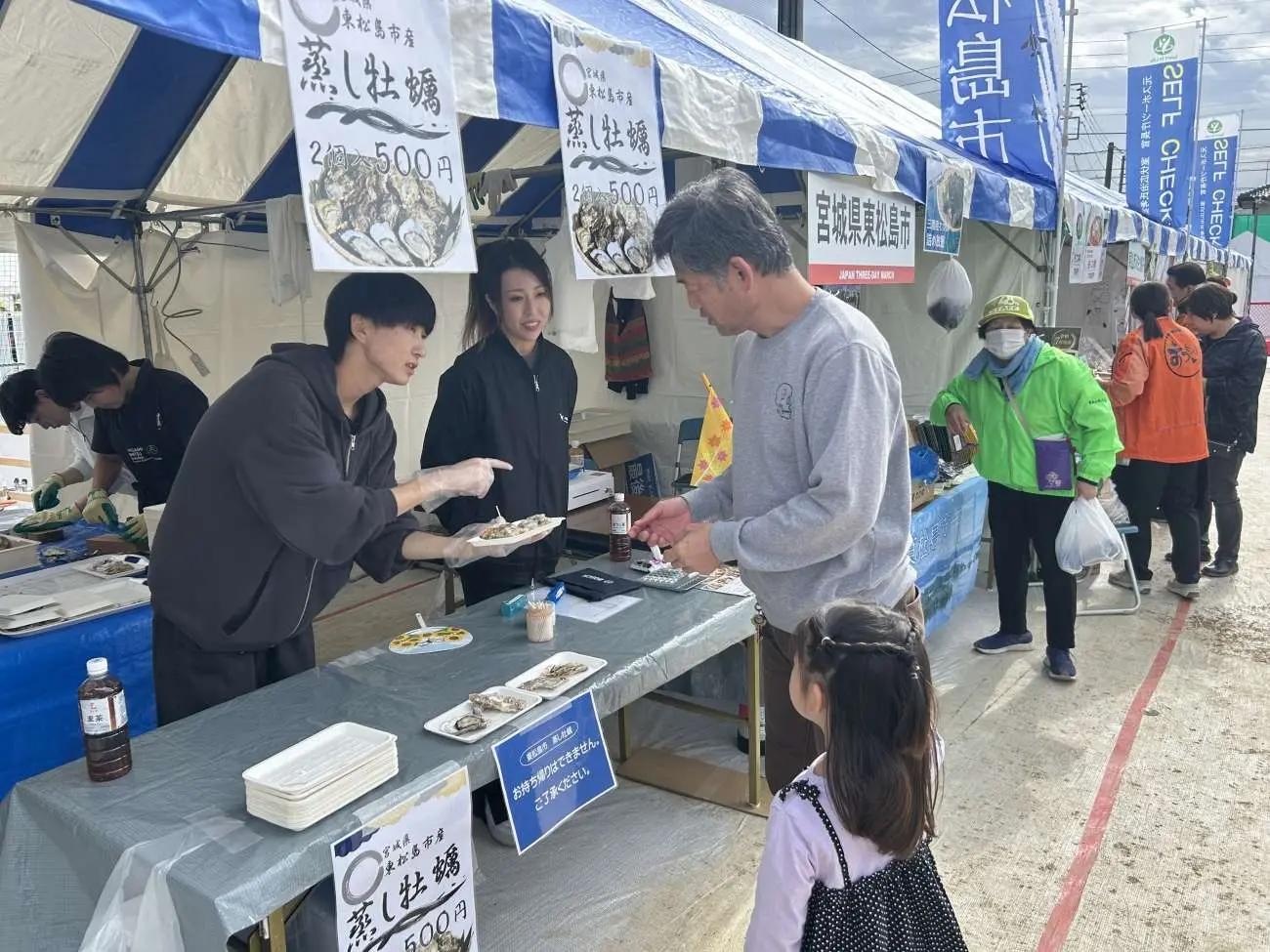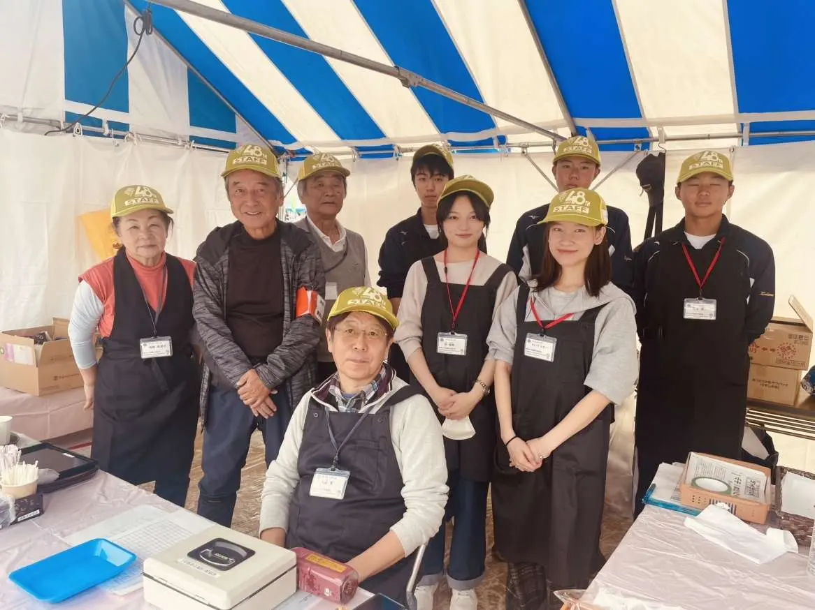 大会期間中の3日間を通じて、開催地の埼玉県東松山市と友好都市でもあり、本学とも地域連携基本協定を締結し様々な交流事業を行っている宮城県東松島市の物販・観光PRブースで、本学学生が運営のお手伝いをしました。東松島市の代表的な特産品の一つで、毎年多くの方々にリピートいただいている蒸し牡蠣や、焼き海苔やのりうどんなどの特産品の販売を行い、ご来場された方々へ東松島市の魅力をPRしました。
