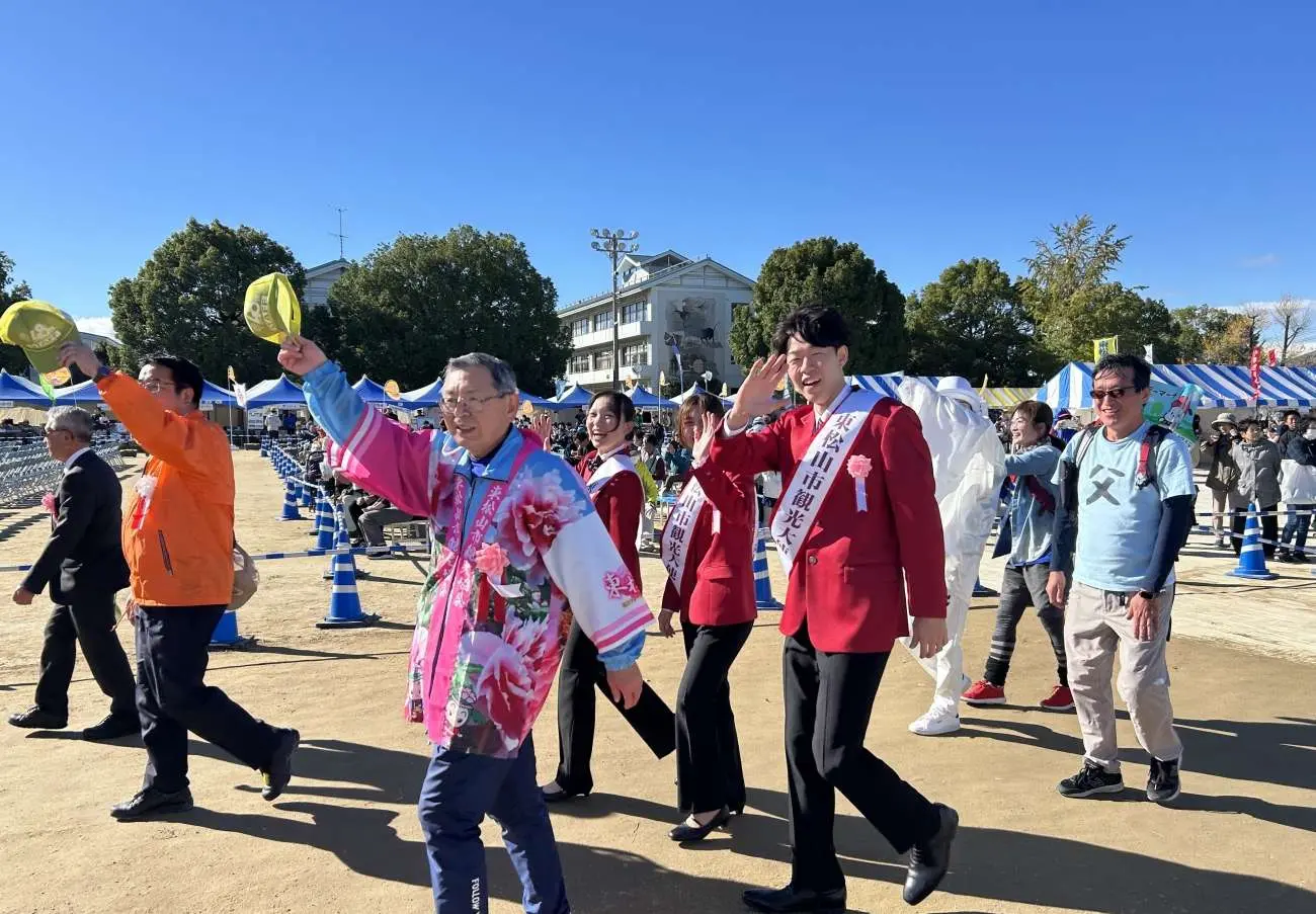11月1日(土)、朝のスタート時の出発式では、朝陽が昇る中、東松山市観光大使を務める特別強化運動部の学生2名が出席し、参加者の出発を見送りました(写真は男子バスケットボール部/中村英司さん)。