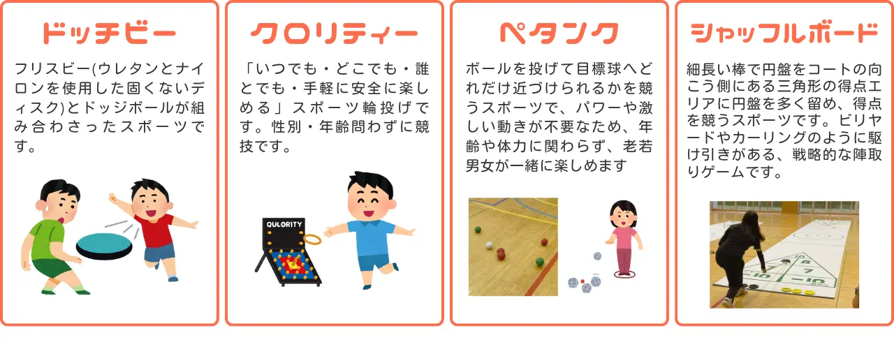 懐かしい9号館アリーナを常時開放いたします。身体を動かしたり、アリーナを懐かしんだり、同窓でお集りいただけます。また、以下のニュースポーツ(クロリティー・シャッフルボード・ドッチビー等)もご用意しております。スタッフが遊び方を説明しますので、どなたでも体験できます!