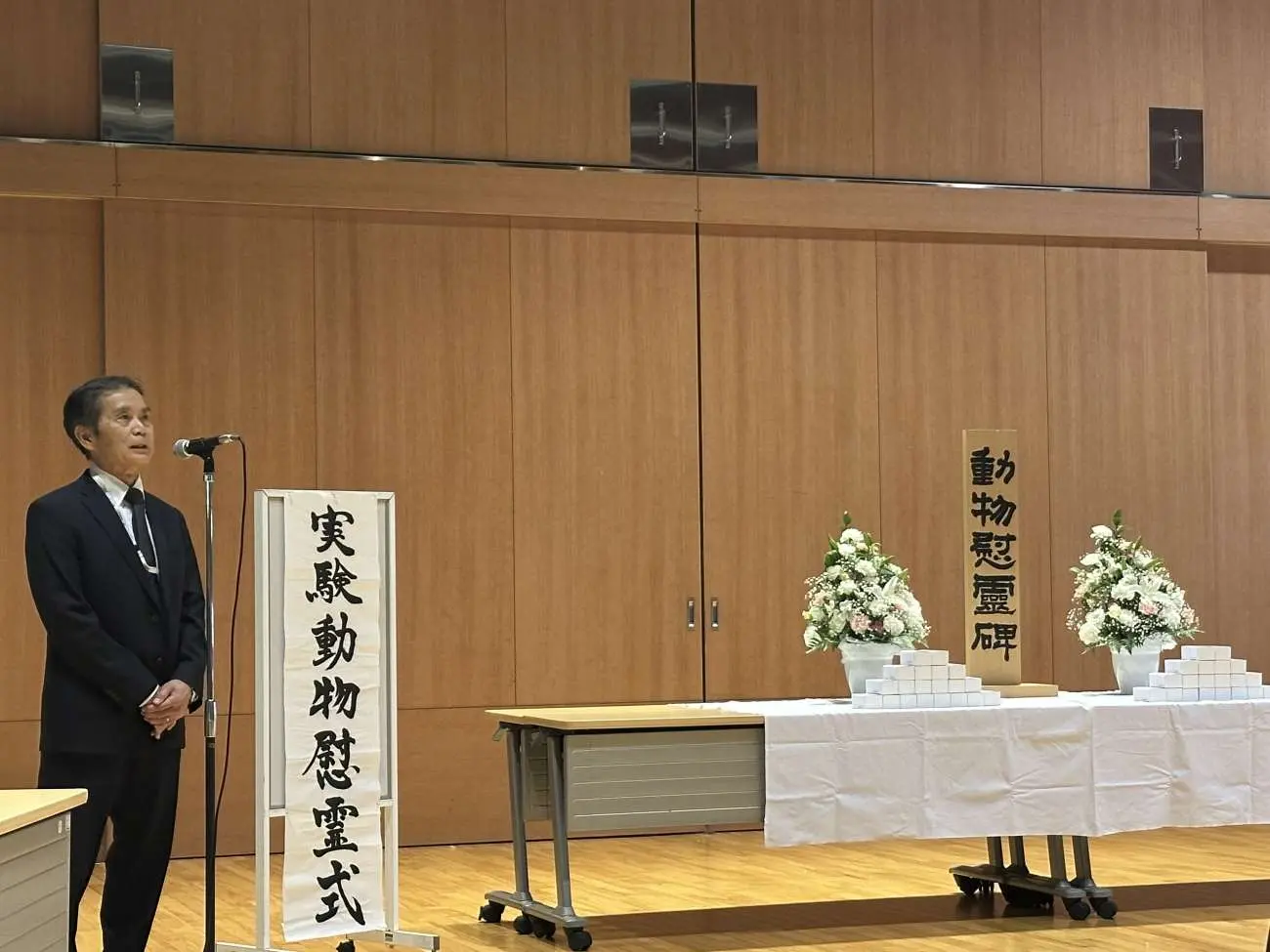 動物実験委員会委員長の大城聰名誉教授(スポーツ・健康科学部元教授)からは健康科学ならびにスポーツ科学の発展が尊い実験動物の命の犠牲の上に成り立っていることを再確認し、動物愛護の精神を持って動物実験を行うことの重要性が弔辞とともに述べられました。